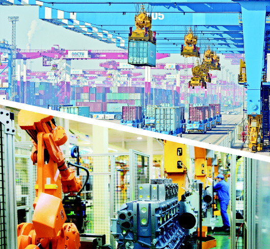 上图为青岛港全自动化码头。下图为潍柴二号工厂。