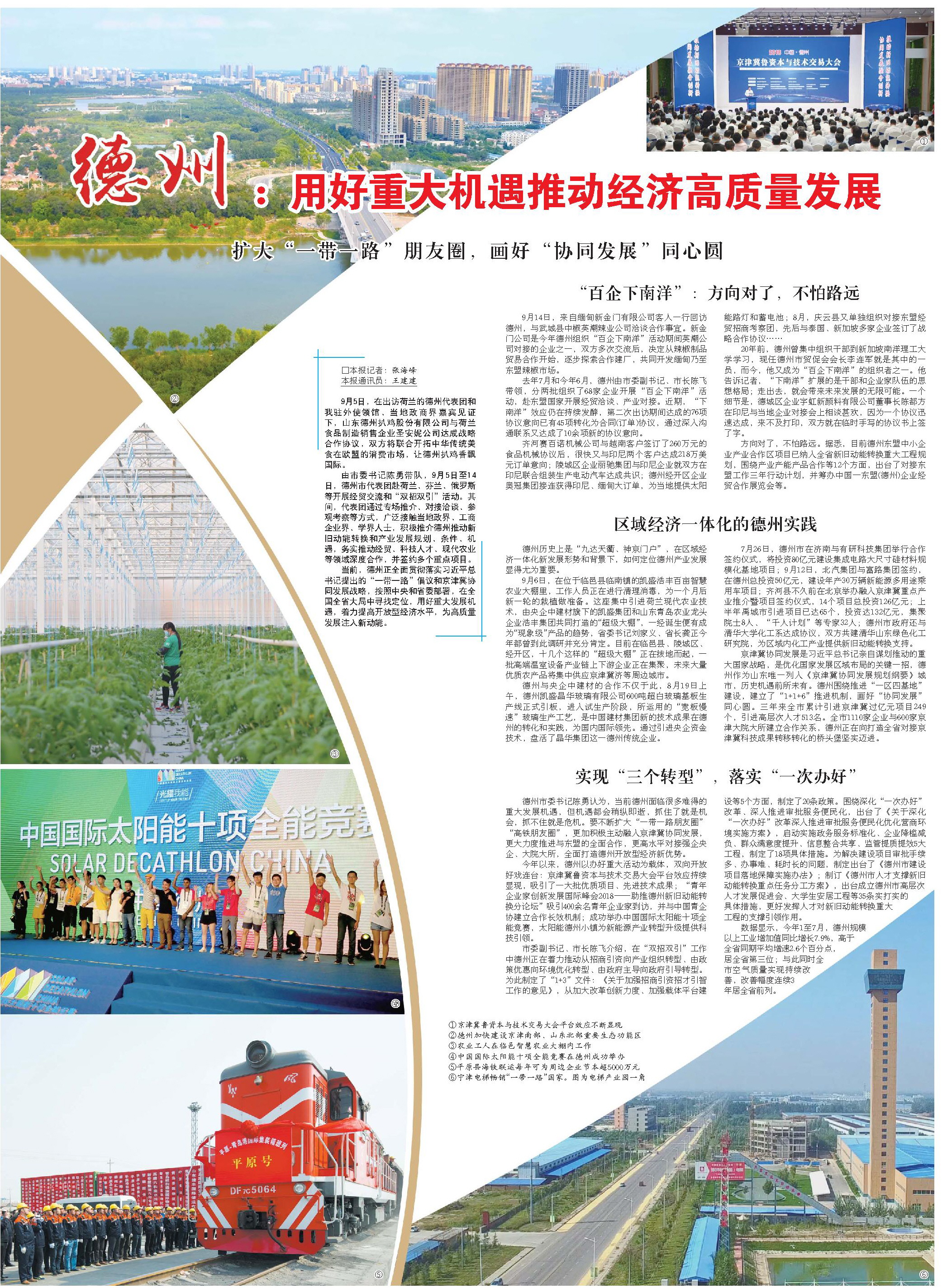 今年以来,德州以办好重大活动为载体,双向开放好戏连台:京津冀鲁资本与技术交易大会平台效应持续显现,吸引了一大批优质项目、先进技术成果;“青年企业家创新发展国际峰会2018——助推德州新旧动能转换分论坛”吸引400余名青年企业家到访,并与中国青企协建立合作长效机制;成功举办中国国际太阳能十项全能竞赛,太阳能德州小镇为新能源产业转型升级提供科技引领。