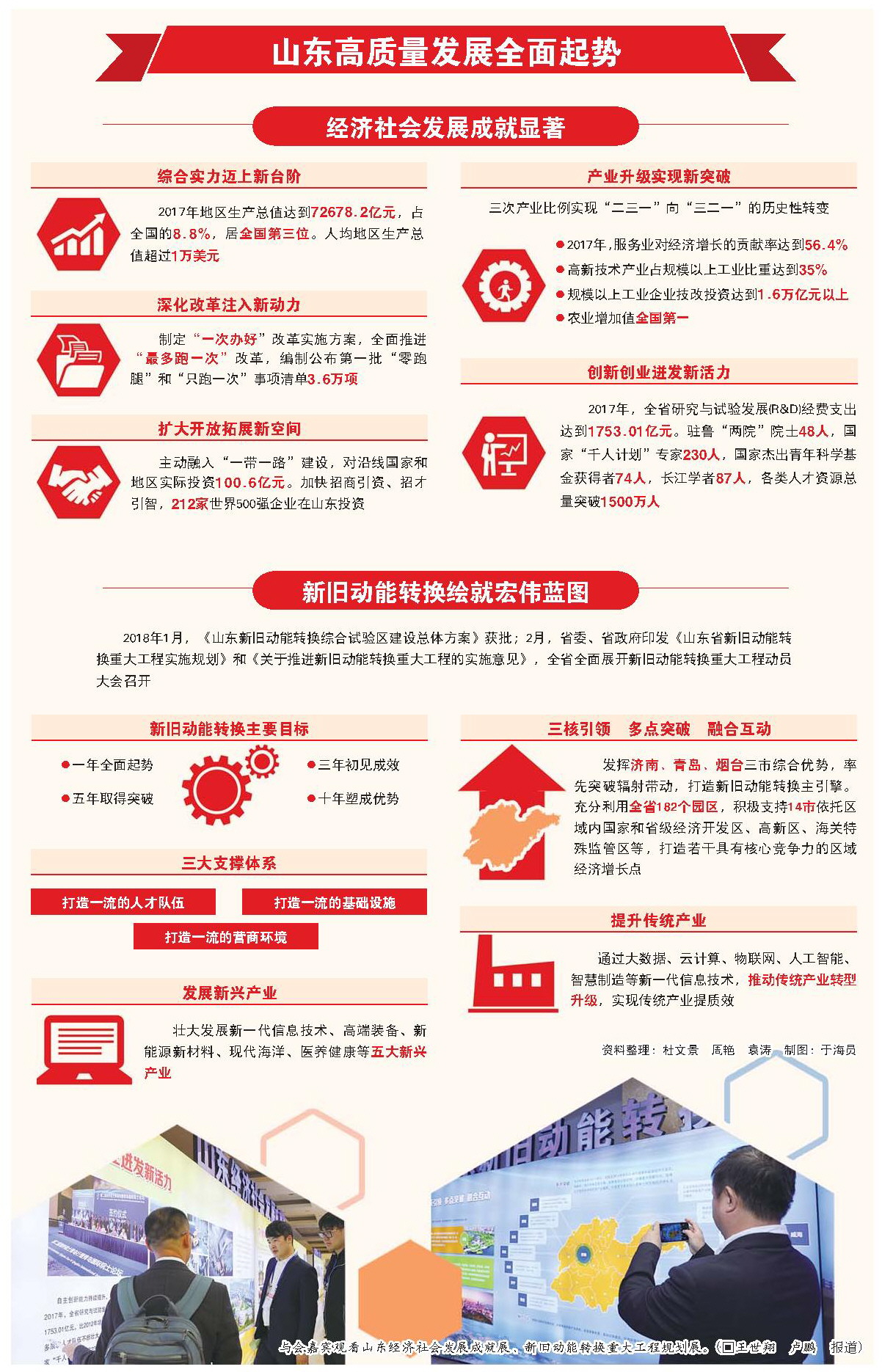 实施新旧动能转换重大工程是山东的重大机遇,也是重大挑战。实现凤凰涅槃、浴火重生,既是攻坚战也是持久战。今年1月,《山东新旧动能转换综合试验区建设总体方案》获批;2月,省委、省政府印发了《山东省新旧动能转换重大工程实施规划》和《关于推进新旧动能转换重大工程的实施意见》,召开了全面展开新旧动能转换重大工程动员大会。
