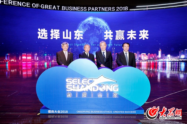 大众网济南9月30日讯 (记者 樊思思)“选择山东,共赢未来!”在29日上午举行的儒商大会2018开幕式上,美国麻省理工学院教授丁肇中,全国工商联党组副书记、副主席樊友山,山东省委书记、省人大常委会主任刘家义,省委副书记、省长龚正,共同按下“选择山东”云平台启动键。